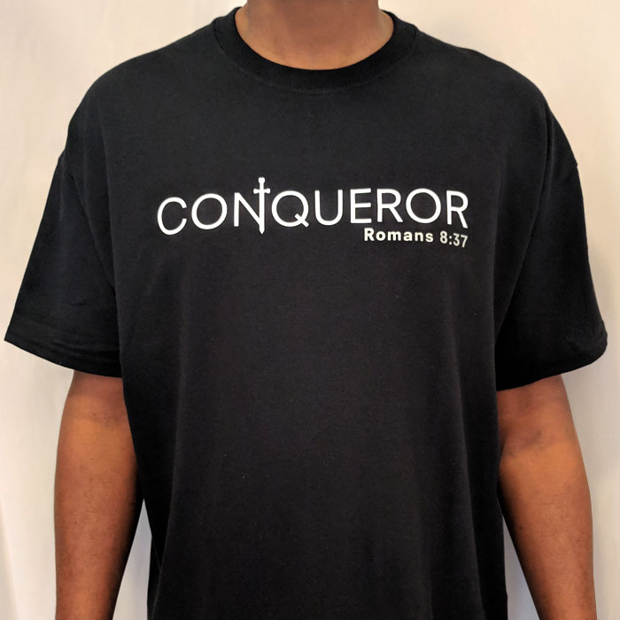Feel like more than a conqueror through Jesus Christ when you wear this black, short-sleeve classic tee. This shirt pairs well with your favorite denim jeans, shorts, or even khakis.